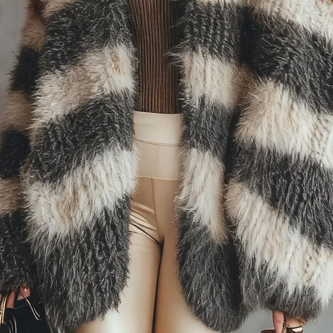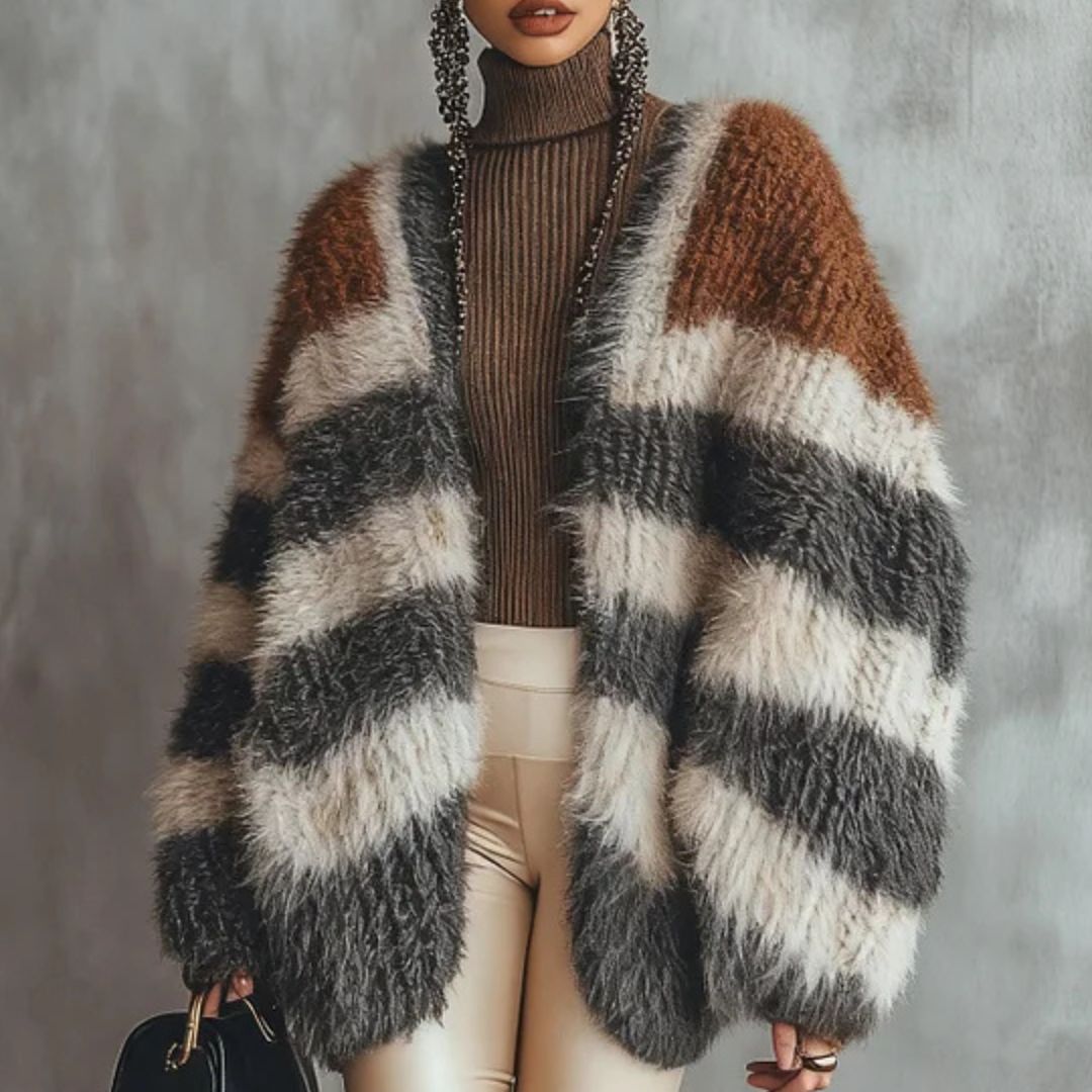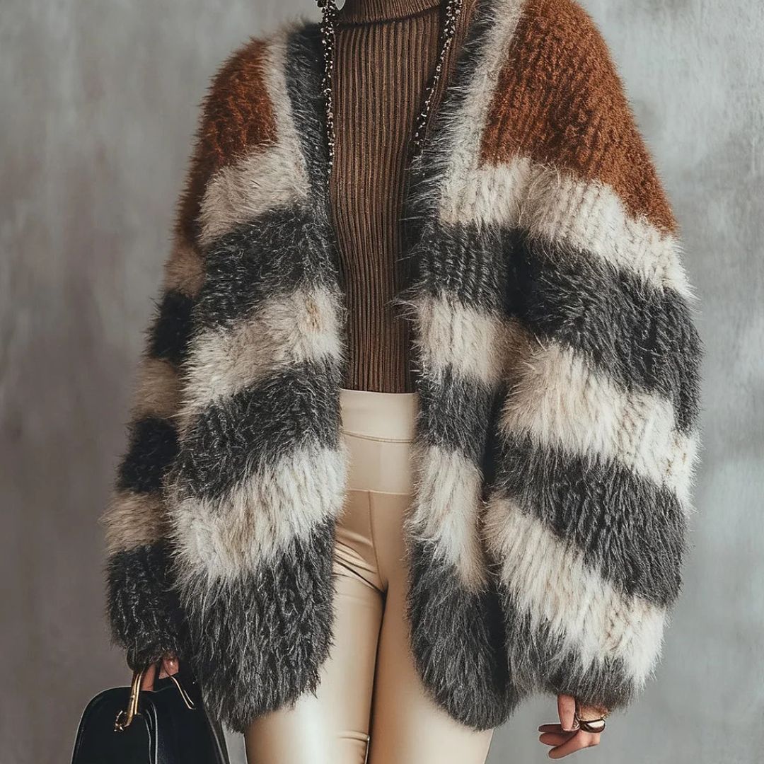 Este Abrigo de franjas es la prenda ideal para darle un giro sofisticado a tus outfits. Con su diseño oversized y combinación de colores neutros con toques cálidos, logra un balance perfecto entre comodidad y estilo moderno.