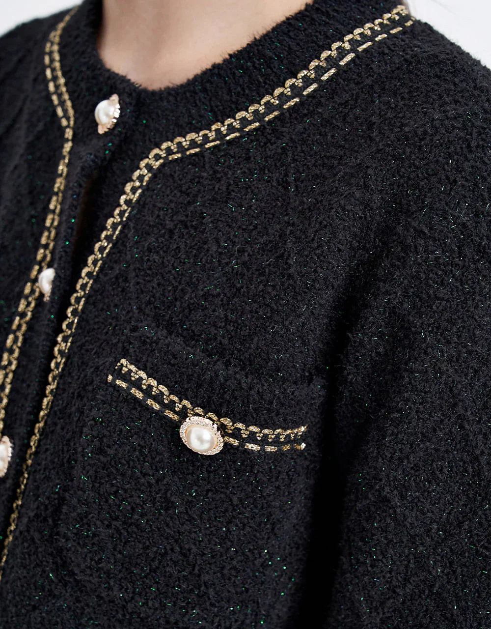 Diseño Elegante: Detalles intrincados en el ribete y botones de perla que añaden un toque lujoso.