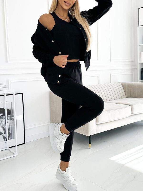 Este elegante conjunto presenta un diseño chic y deportivo, perfecto para el uso diario. Confeccionado para ofrecer comodidad y versatilidad, este set incluye una blusa de manga larga con cuello redondo, pantalones a juego y una chaqueta estilosa, lo que te permite combinar y mezclar con facilidad.